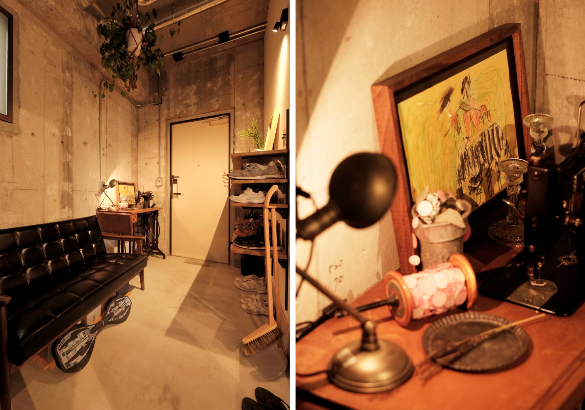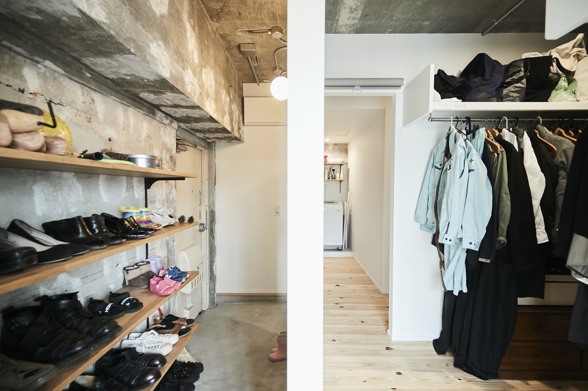 躯体現しのヴィンテージテイストの空間。玄関から続く広々とした土間には、使い勝手の良い可動棚を備え、収納力と機能性を両立。また、ソファや味わい深い古いミシン台など、お気に入りの家具を並べることで、まるで小さなショップのような雰囲気に。帰宅した瞬間から心がほっと安らぐ、遊び心あふれる土間空間です。