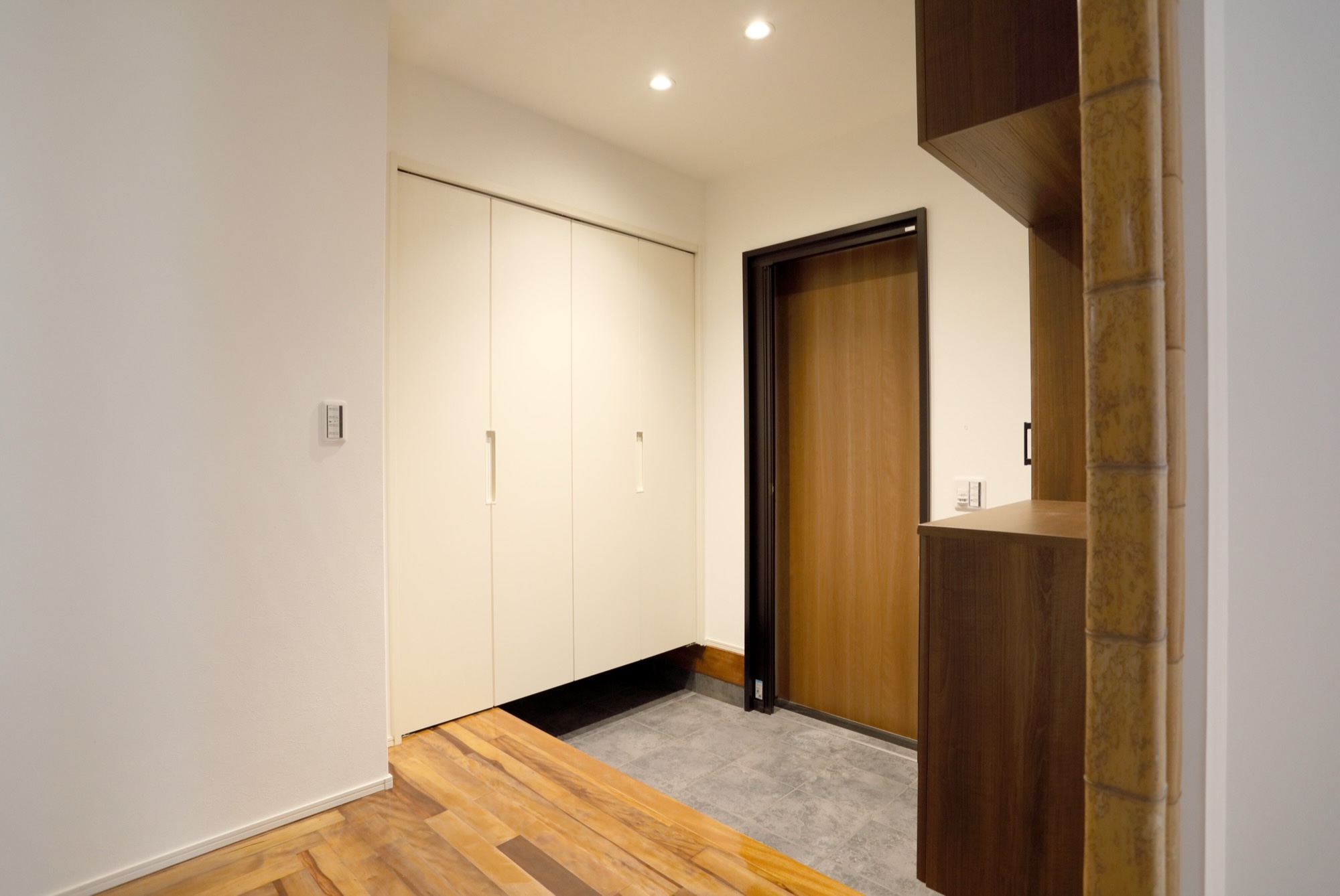 玄関には、ゆとりのある広い土間スペースを設けました。ウォークインクローゼットと一体型にしたことで、靴やアウター、日用品までスムーズに収納でき、使い勝手の良い空間です。
