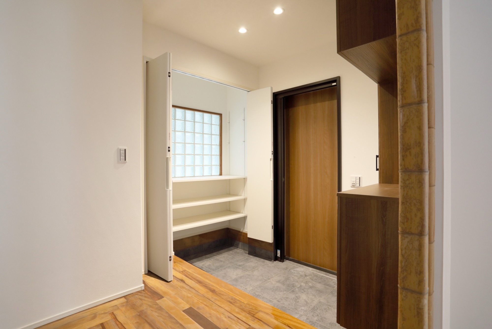 玄関には広々とした土間と扉付きの収納を設け、生活感をすっきり隠せる設計に。扉を開けると、靴や日用品を効率よく整理できる便利な可動棚が広がります。