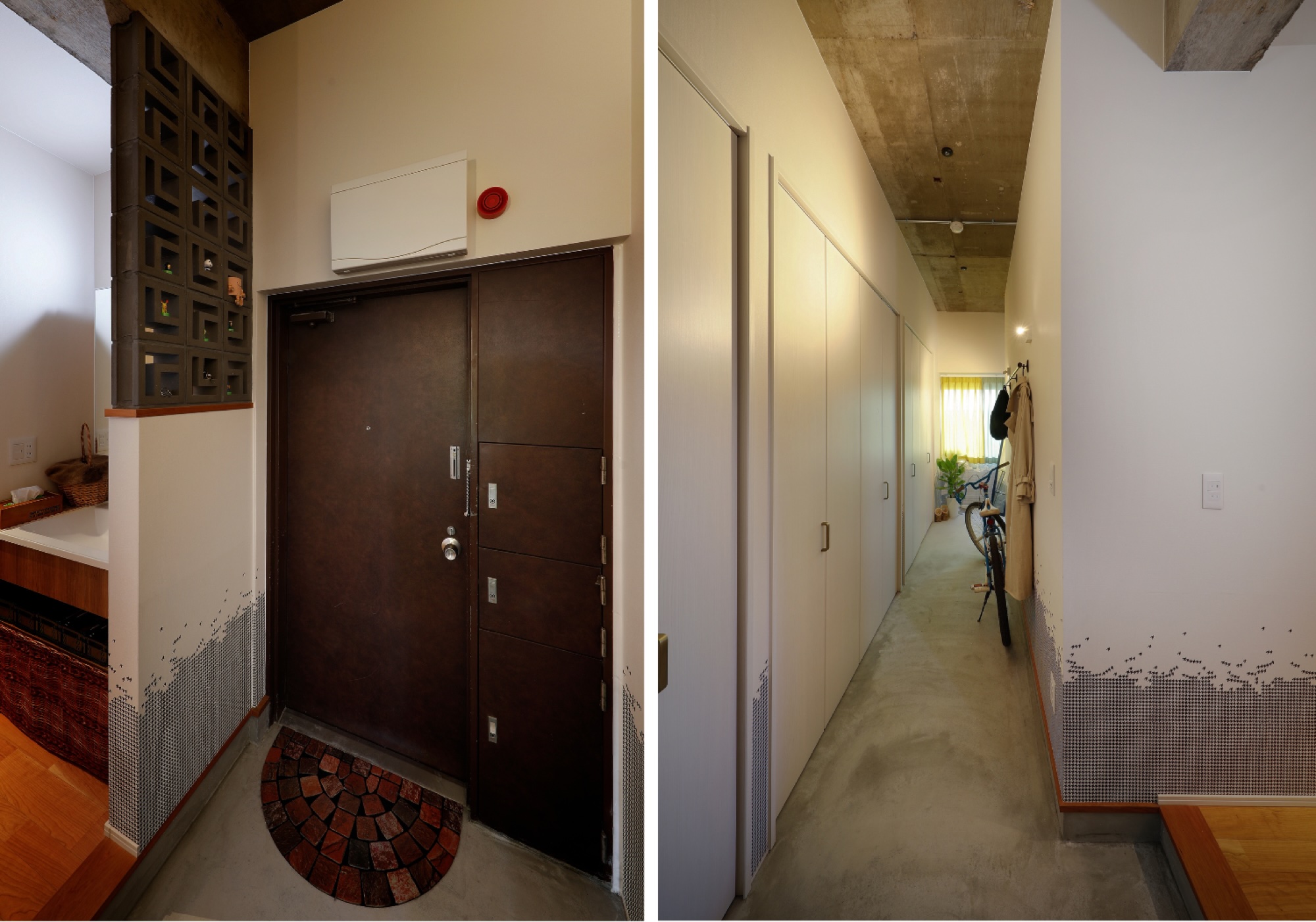 光が差し込むゆったりとした玄関には、自転車を置けるスペースも確保。玄関からLDKへと続く廊下の壁には、ご夫婦の趣味であるレコードを飾るギャラリースペースを設けました。豊富なコレクションの中から、その日の気分で選んで飾る楽しみも暮らしの一部に。「好きなものを、いつでも目に届く場所に置いて、大切に眺めて暮らしたい」という想いをカタチにした、こだわりの詰まった住まいです。