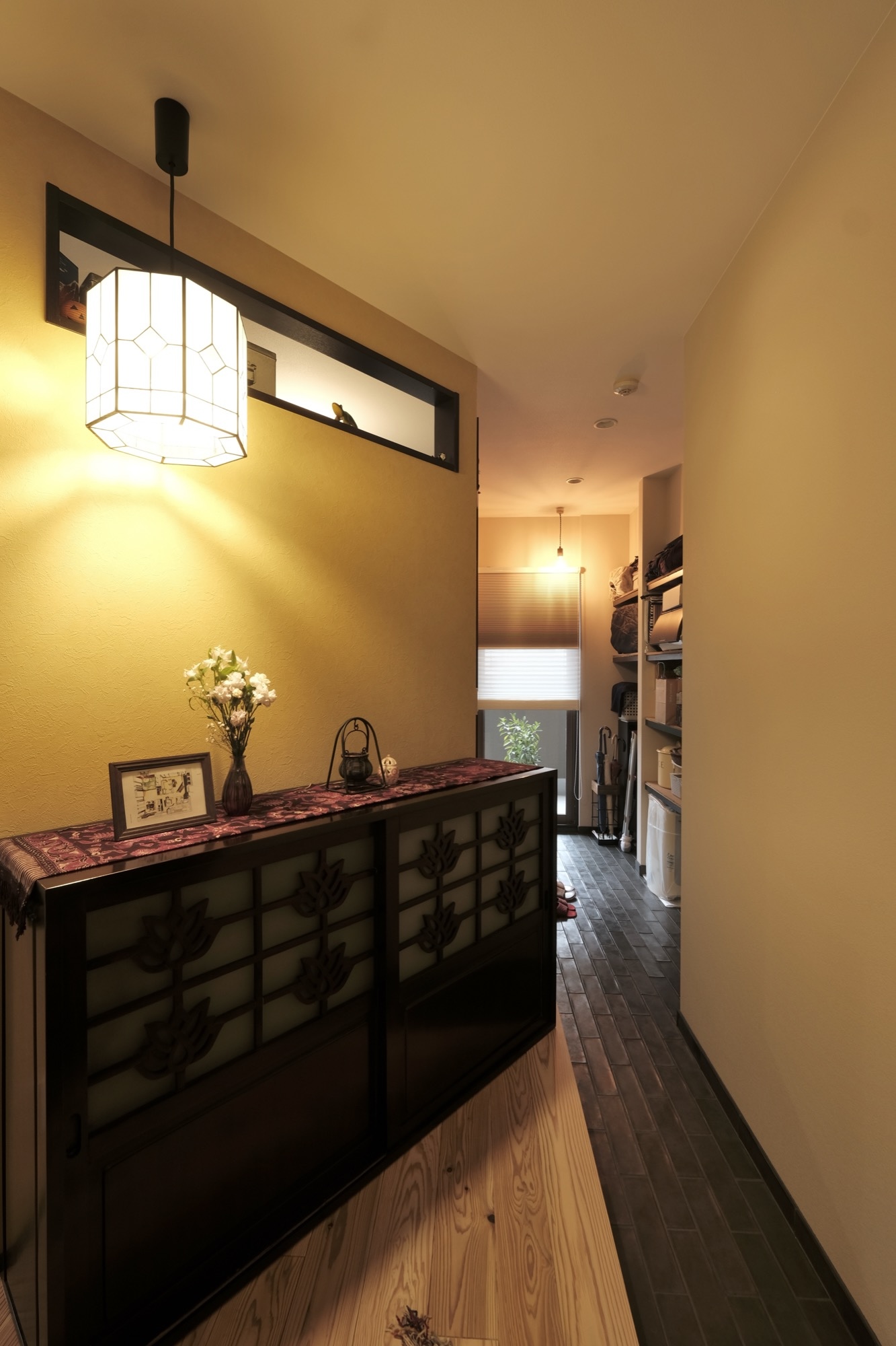 日本家屋の知恵を活かし、靴のまま荷物を持ち込める便利さも備えています。日々の暮らしにゆとりと心地よさをもたらす、機能的で温かみのある玄関です。