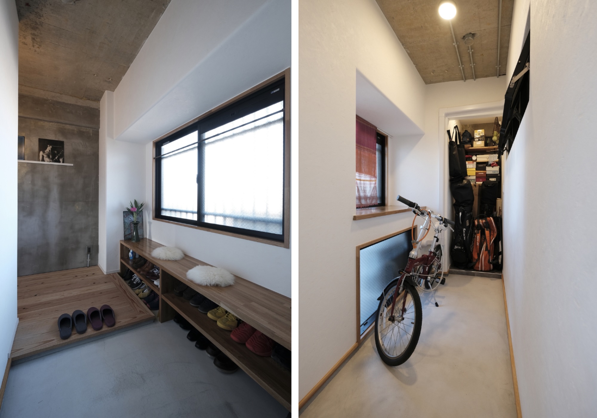 土間スペースには、靴の脱ぎ履きだけでなく、自転車やベビーカーをそのまま置けたり、アウトドア用品の手入れをしたり、ちょっとした作業場として使えるなど、暮らしの可能性を広げてくれます。