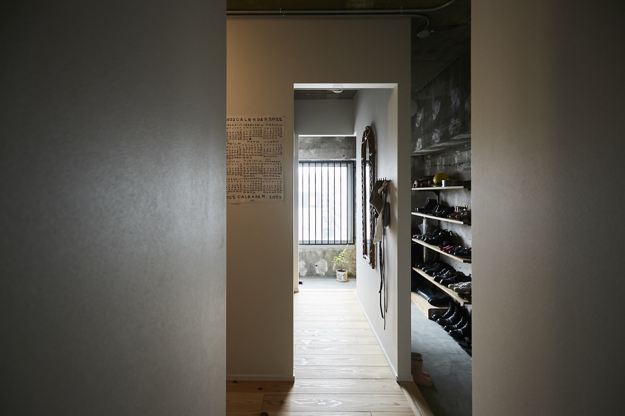 まるでバーを思わせる重厚感のある扉を開けると、右手には洗面などの水まわり、正面には細長く伸びる土間空間が広がります。