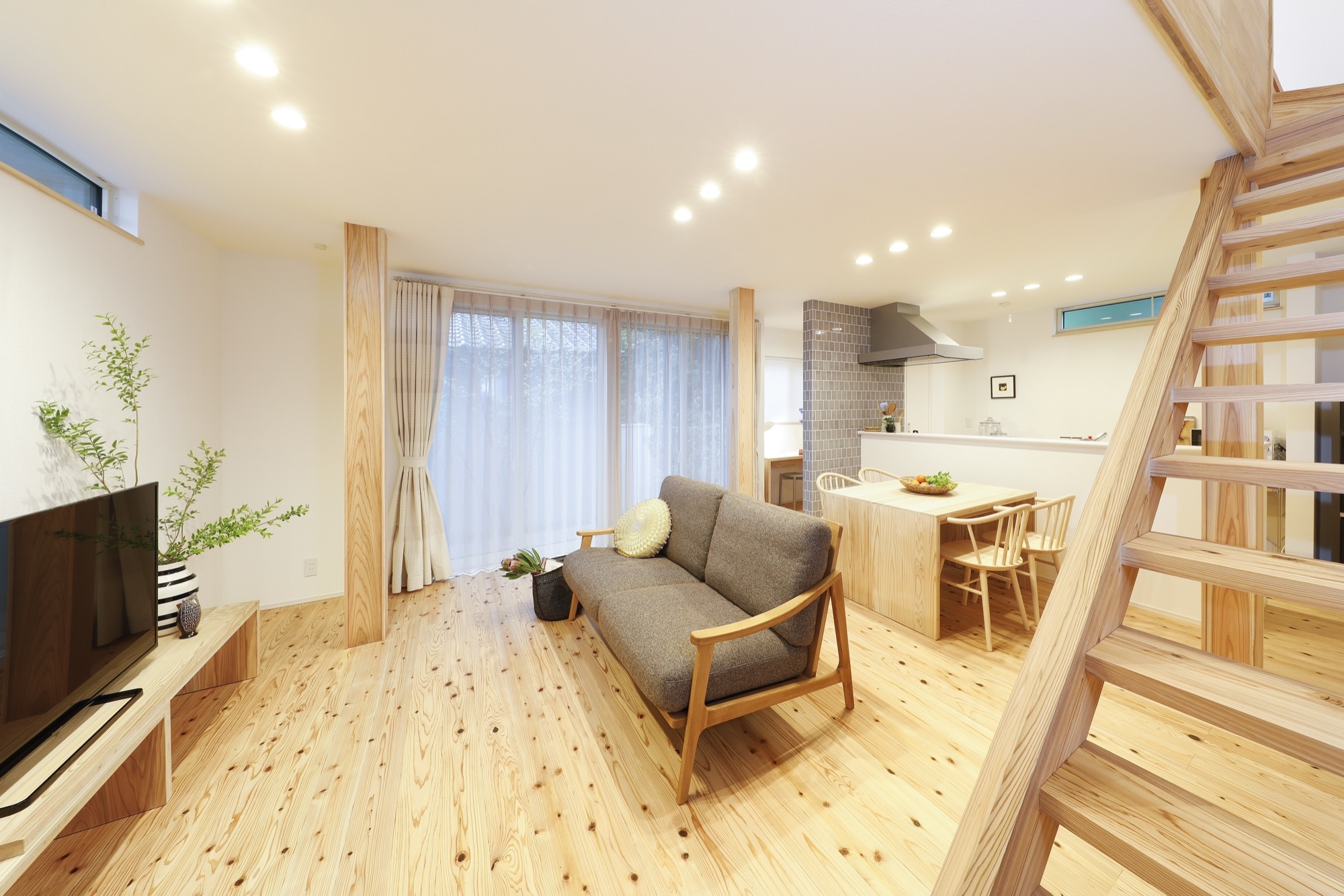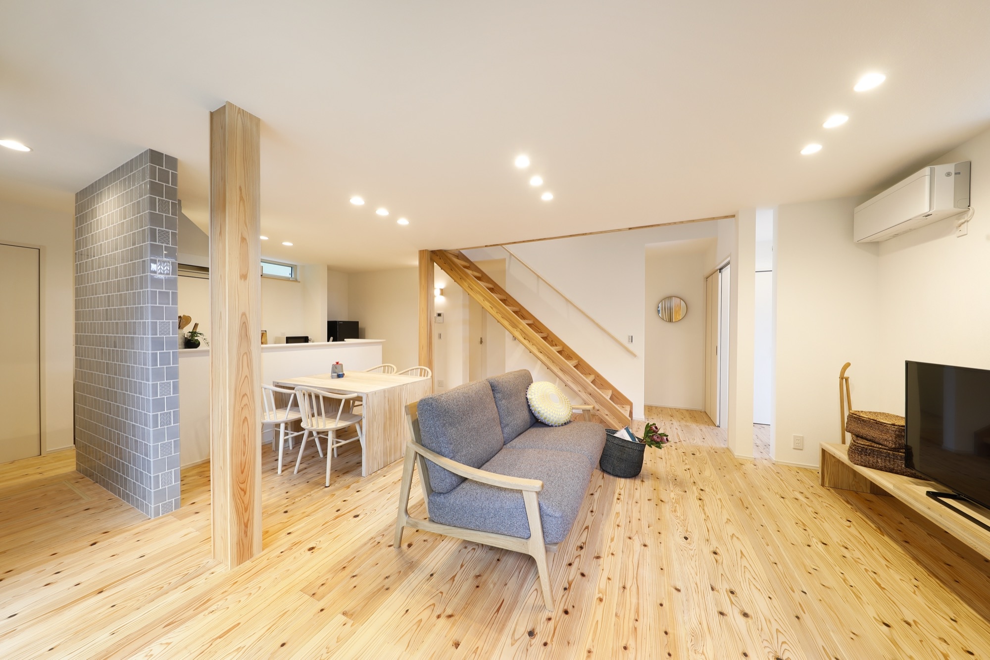リビングの柱は、梁や天井、家具の色みと合わせることで空間全体に調和しています。経年変化による木の風合いが、味わい深い意匠性をもたらします。