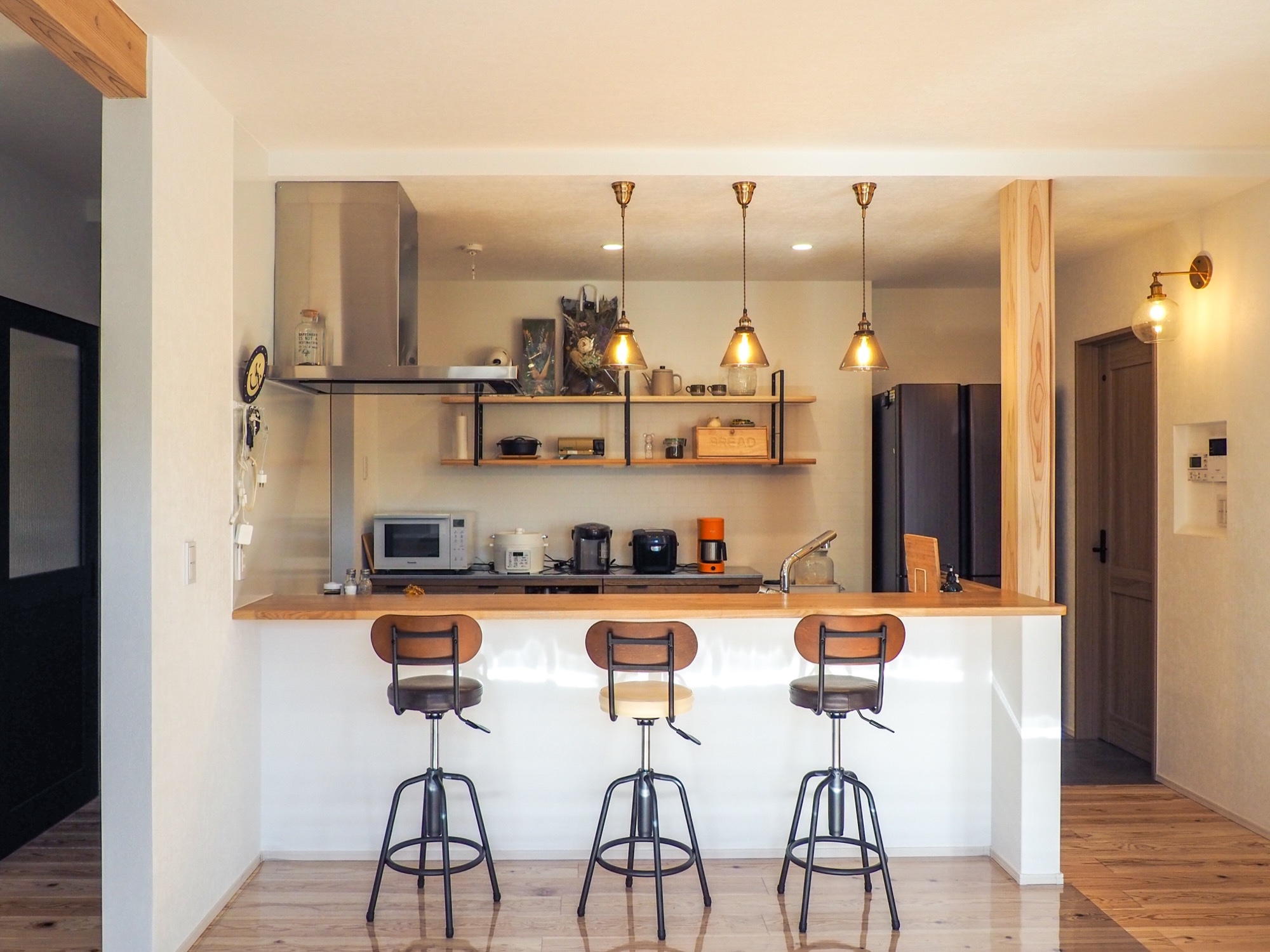 対面キッチンの幅を抜けない柱に合わせて設計することで、存在感を抑えました。柱はちょっとしたメモを貼ったり、小物をかけたりすることも可能。工夫次第で暮らしに役立つスペースになります。