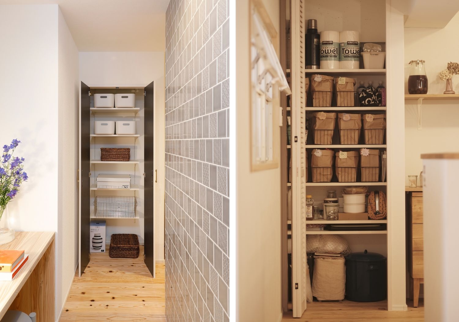 パントリーは、食品や日用品のストックはもちろん、キッチン家電の置き場としても活躍します。リビングやダイニングから見えにくい位置に配置することで、生活感を隠しながら空間を美しく保てます。