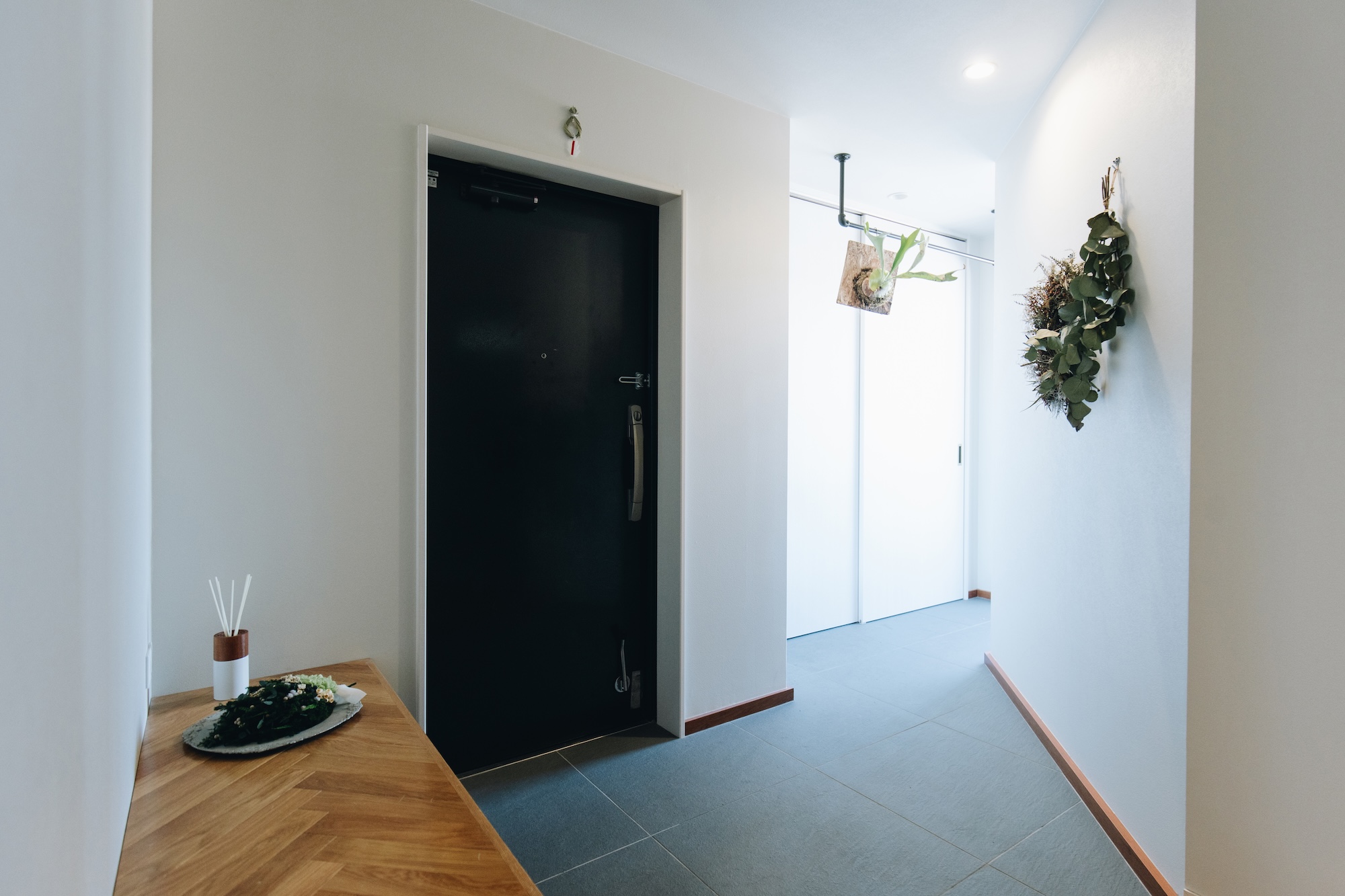 玄関に広めの土間収納を設けることで、出入り口が広々として開放的になります。自転車やベビーカー、アウトドア用品、土付きの野菜など、屋内に持ち込みたくないものをそのまま置けるのが魅力です。