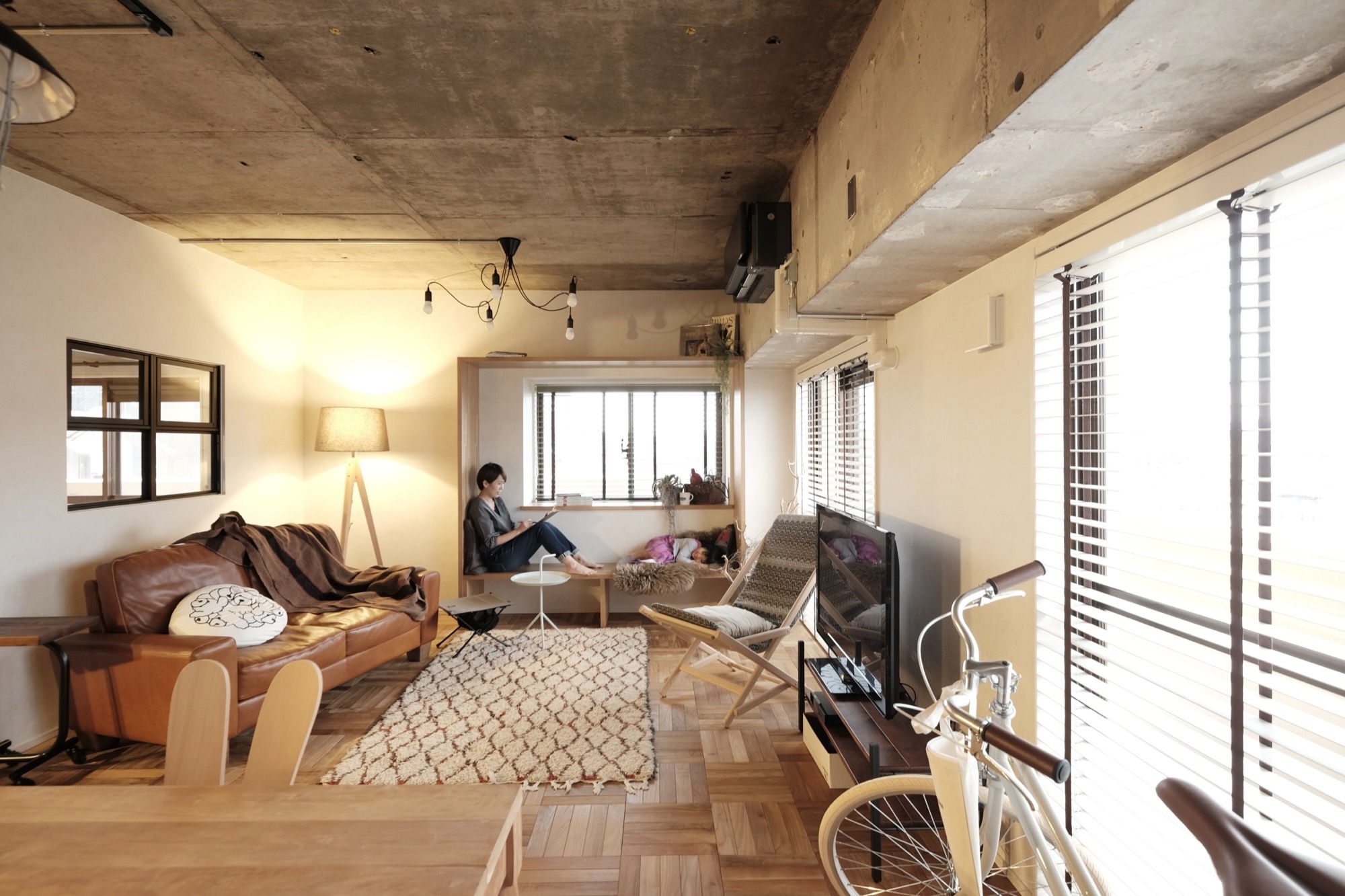 天井は躯体現しにして開放感を演出。床には無垢のパーケット材を採用し、スタイリッシュさと木の温もりを両立させました。