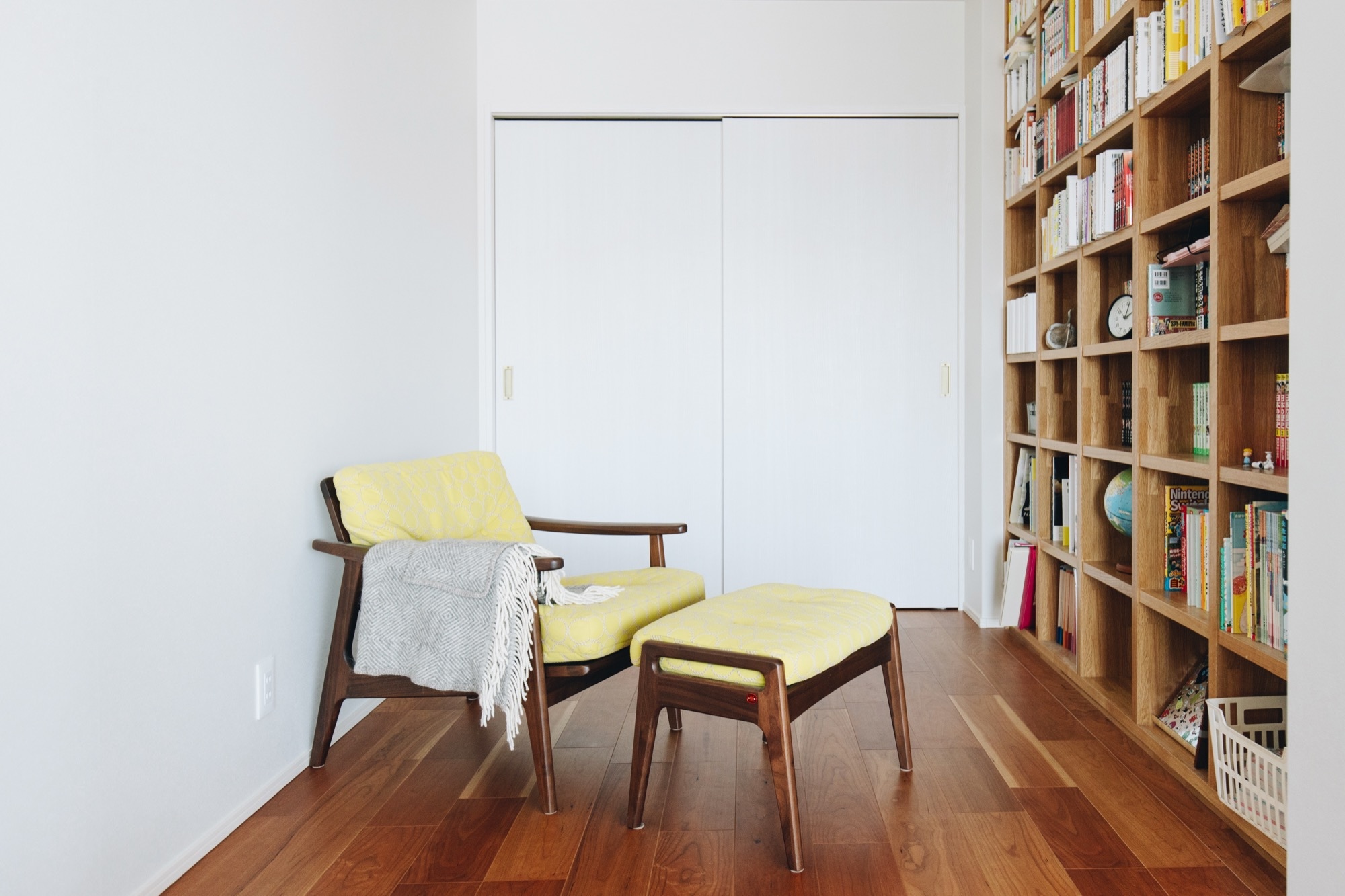 LDKの一角に設けた大きな本棚のある図書コーナー。壁一面の本棚はリビング側から見えにくい位置に配置し、すっきりとした印象に。