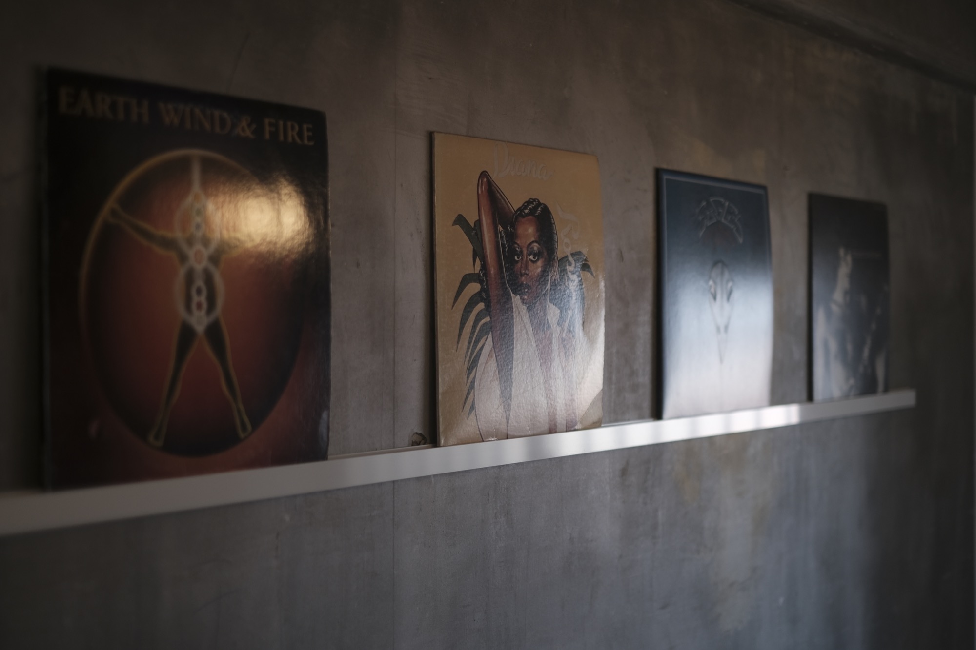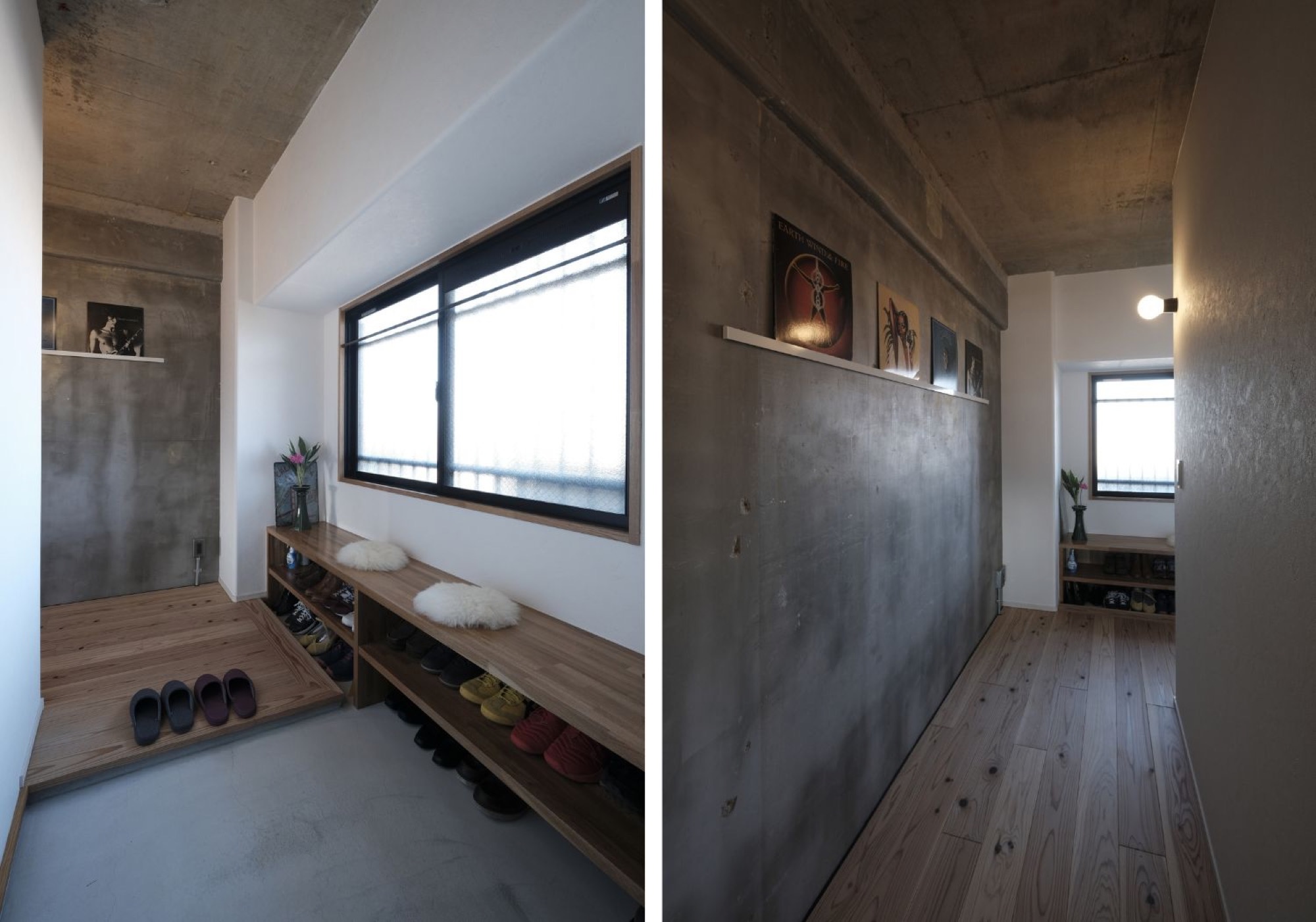 玄関からLDKへ続く廊下の壁に、レコードを飾るスペースを設けました。たくさんのコレクションの中からその時々で、お気に入りのジャケットを入れ替えることで、音楽とアートの両方を楽しめる空間に。