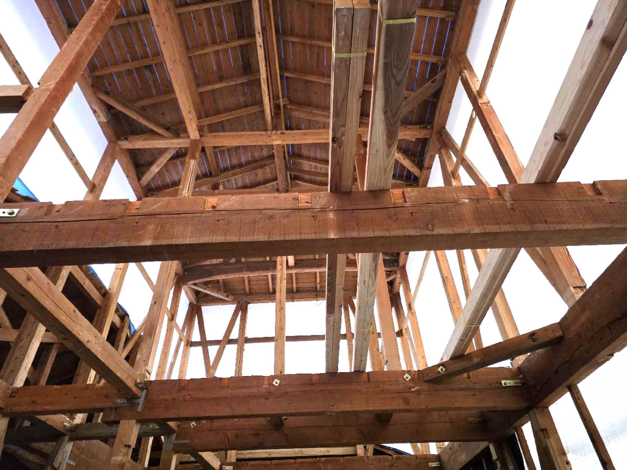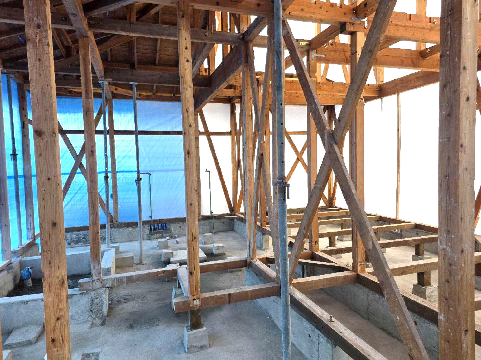 現在は、壁や天井を一度解体し、基礎や柱の補強・再構築を行っている段階です。中古住宅のリノベーションでは、仕上がりだけでなく構造部分の確認と改修が重要です。耐震性能と断熱性能を高めるため、建物の状態を丁寧にチェックしながら工事を進めています。