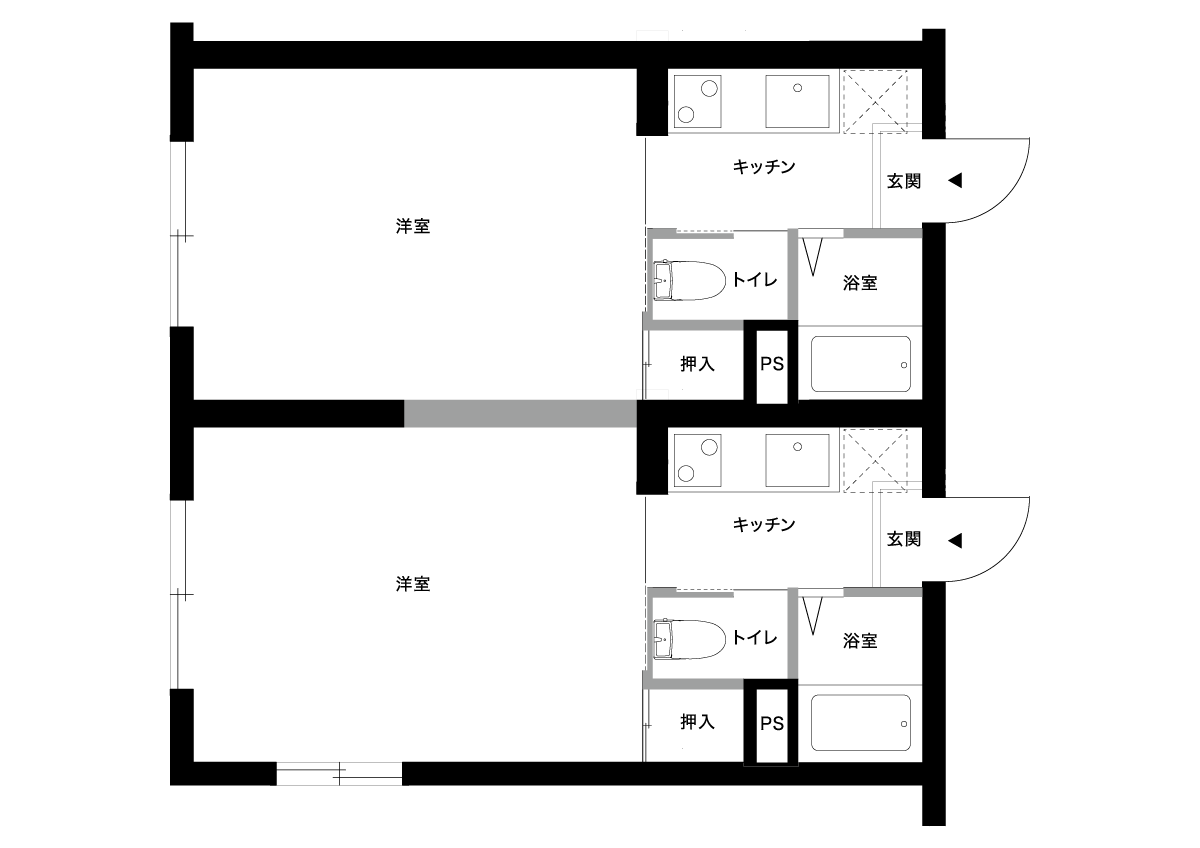 既存物件は1Kがたくさん並ぶマンション構成でしたが、耐力壁の一部があとで取り壊してつなぐことができる造りになっていました。1Kの2住戸をつなげて1LDKの1住戸にリノベーションしました。それぞれあった玄関はあえて塞がずにそのまま活かし、片方は玄関、片方はWICの中に位置するように間取りを工夫して、勝手口のように使えるようにしました。帰宅時に直接WICにアクセスできるので、着替えに便利な間取りです。