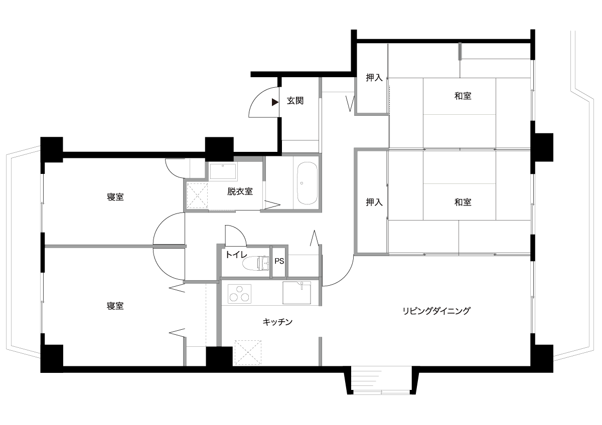 リノベーション後は、食事とくつろぎのスペースを棲み分けて、家族の集まるLDKは広々とした開放的な空間に、キッチンは作業がしやすく洗面や浴室にもアクセスしやすい設計としました。また、畳スペースは客間を兼ねたウォークインクローゼットにして、衣類等をしまう場所を集約しています。