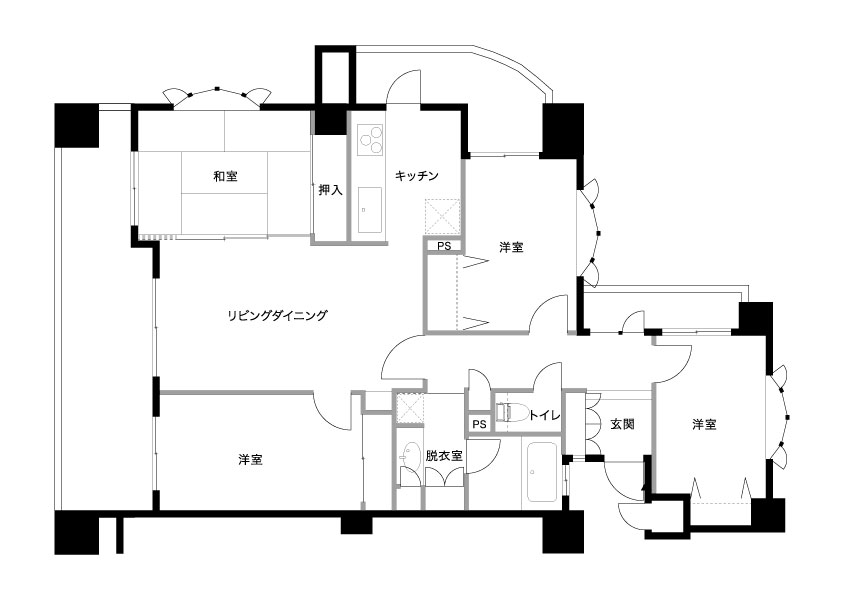 奥まっていたキッチンはリビングの中心に配置し、和室は無くして家族みんなでゆったりとくつろげる広いLDKに変更しました。隣り合う寝室は高さのあるガラスの引き戸で開放的に。キッチンからパントリー・WIC・脱衣室・トイレまでは回遊動線としました。収納量もぐっと増え、機能的で家族でゆったり過ごすことのできる住まいになりました。